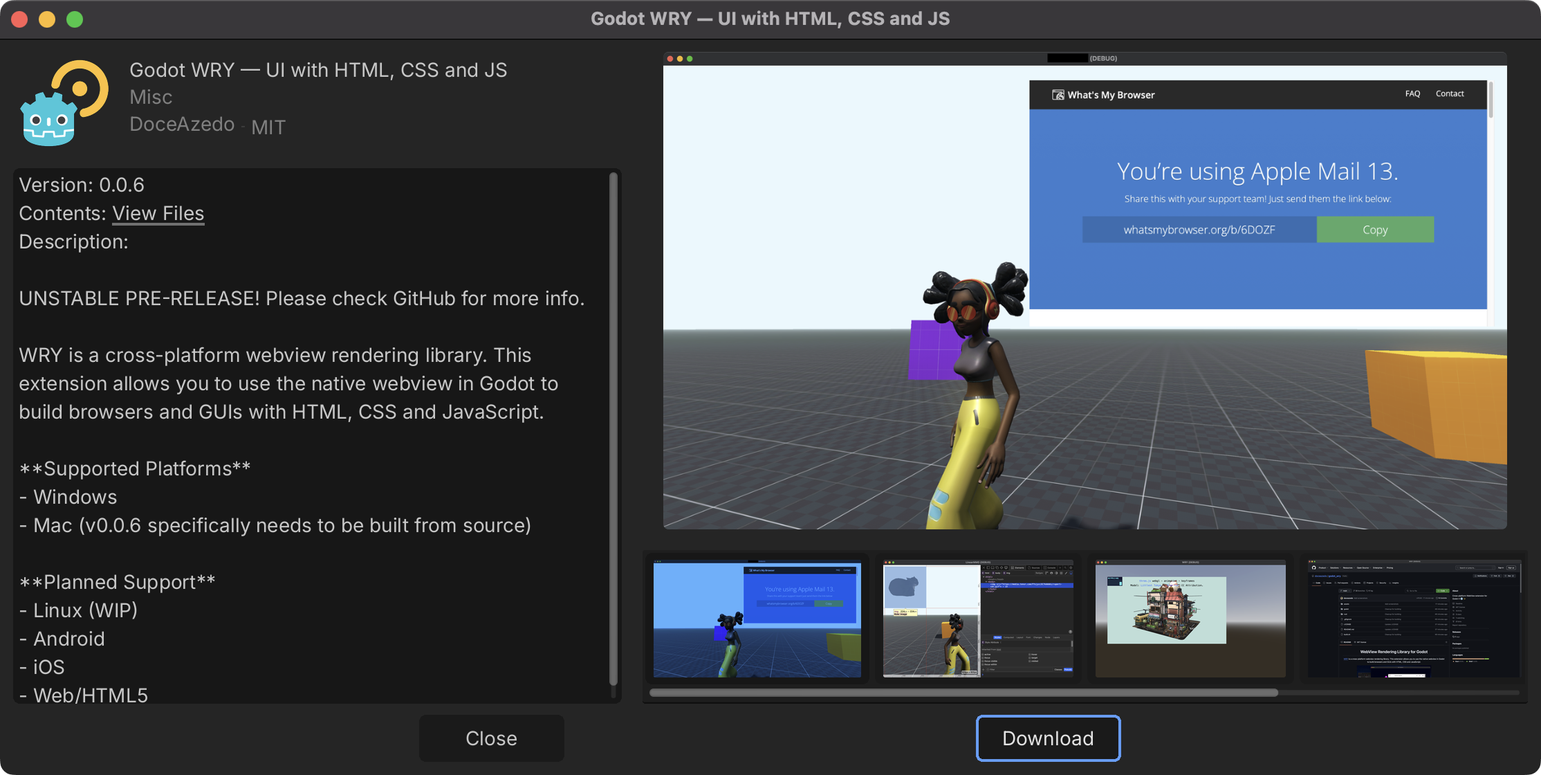The easiest way to install Godot WRY is through Godot's Asset Library. You can install it via the editor by following these instructions: