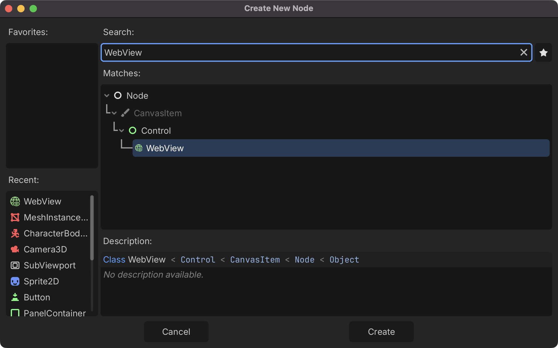 Once Godot WRY is installed and enabled, you can add a WebView node to your scene: